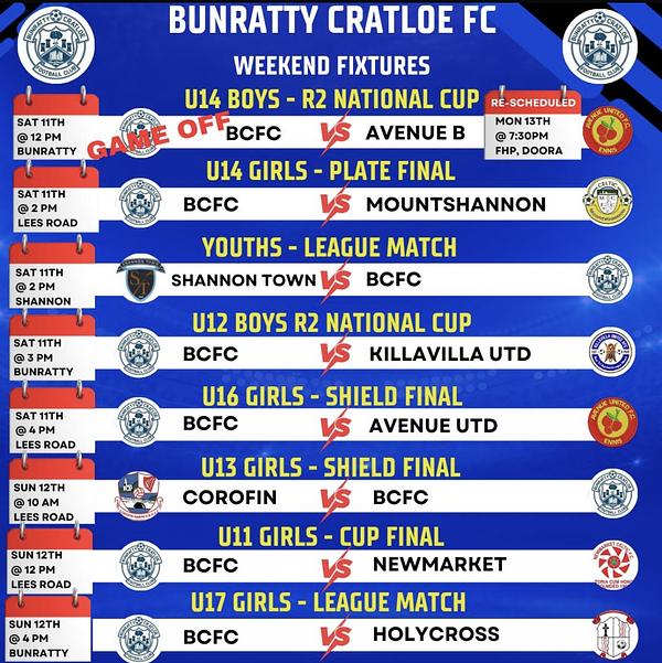 Very best of luck to all Bunratty Cratloe FC teams involved in Finals, National Cup & League matches this weekend.