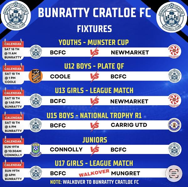 Best of luck to all Bunratty Cratloe FC teams involved in National Cups & League matches this weekend.