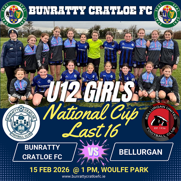This is an amazing achievement and the first time any team in the club has got this far in the All Ireland Competition. It would be great to get a massive Bunratty Cratloe FC crowd behind the girls this Sunday (15th) in Woulfe Park, Bunratty @ 1pm.