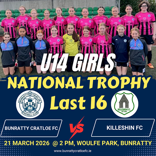 Very best of luck to our U14s Girls who are into the Last 16 of the SFAI National Trophy vs Killeshin FC on Saturday 21st March at 2pm in Bunratty.