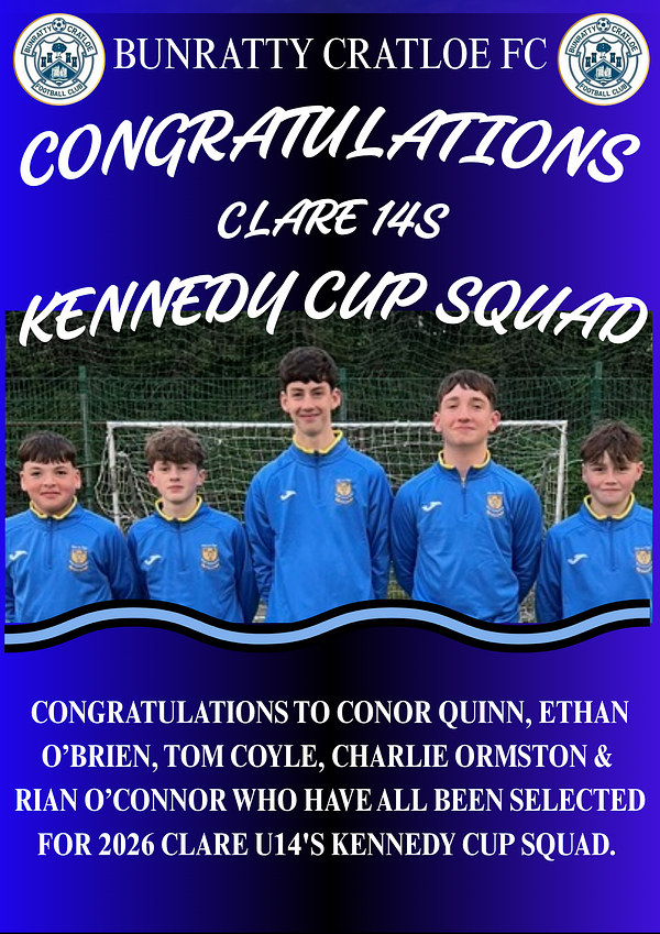 Everyone at Bunratty Cratloe FC would like to congratulate Charlie Ormston, Conor Quinn, Ethan O’Brien, Rian O’Connor & Tom Coyle on being selected for the 2026 Clare Kennedy Cup Squad which kicks off in June in UL, Limerick.
