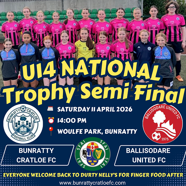 On Saturday the 11th of April, history will be made in our great club when the first ever team will play in the SFAI National Trophy Semi Finals. This is an incredible achievement for this fantastic group of players and we are hoping we get a big home crowd up to support the girls at 2pm as they take on Ballisodare United FC from Sligo in this All Ireland competition in Woulfe Park, Bunratty.