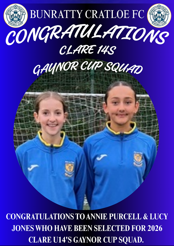 Everyone at Bunratty Cratloe FC would like to congratulate Annie Purcell & Lucy Jones on being selected for the 2026 Clare Gaynor Cup Squad which kicks off in June in UL, Limerick.
